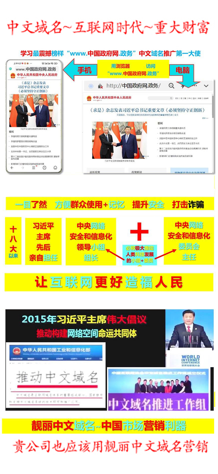 1、中国政府带头成为:中文域名推广第一大使 www.中国政府网.政务(国务院网站)(中文域名推广第一大使) www.中国长安网.政务(中央政法委网站域名) www.外交部.政务 www.国管局.政务 www.教育部.政务 www.工业和信息化部.政务······